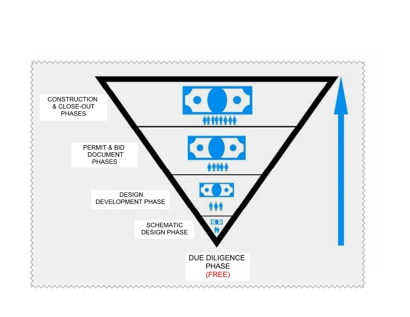 The "Upside Pyramid of Design" diagram illustrates the basic steps involved when embarking upon your remodel of new construction journey. Of critical importance is understanding that early selection of a good design will not only make the upper phases of the project flow but also be the least costly.